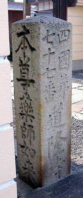 その18 徳右衛門が丁石建立を始めた寛政六年のものとして本稿「その4」で述べているのだが、もう一基同じく讃岐七十七番道隆寺北口の一基について。これは「その3」のカットで示したモデル図と大いに異なっているのである。 モデル図では【正面】ア字・大師坐像・札所までの距離。そして側面(向右に)施主、向左面に願主。となっている。処が道隆寺のものは四面に刻字があるのである。正面は「四國第七十七番 道隆寺」とあり、その向って左面に「本尊薬師如来」とある。向かって右面には「是より右宇多津、道場寺迄一里半」と里程を指示しているのだが、さらに「発願者与州・・・・、勧誘者坂本伊右衛門」とある。「・・・・」はよく読み取れ無いが「徳右衛門」であろう。坂本氏は近在の有力者であろうか。 裏面に「寛政六甲寅歳季冬日」とある。そして問題なのは下部に仏像らしきものが陽刻してあったのが欠けていることである。それは薬師仏らしくもあり、また弘法大師像のようにも見えるのである。見分け難いほど欠けているのは何故であろうか?単純な風化損亡ですまされることであったのであろうか?下部に彫刻していたのがわざわいしたのであろうか。願主・施主の用語がなく「発願者・勧誘者」の表現も凝っているし、本尊名をいれたのも珍しい。これは多分に「坂本氏」の意図が強く働いたからであろう。