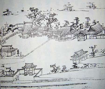 吉祥寺境内図 門前の立石と茶堂に注目! 現在は写真のように北口に立っています。「これよ里 前神寺へ廿丁」なのですが上部大師坐像下には「吉祥寺」とあり、寺号石の役割も担っています。これが後世に改変されたものでは無いでしょうか。内側に窪んでいるのでそのように推測されるものです。 なお文化元年1803の『海南四州紀行』に次の様な記述がありました。 吉祥寺・・・茶堂、二重やね、二間に長四間四方一間ツツ外を出す、総て瓦なり。 裏門より入表門に出る也。 丁石もですが、図会の向かって右側手前にある建物=二重屋根の立派なもの(但し吹きさらしの様である)が《茶堂》です。 - H20.04.29 |
